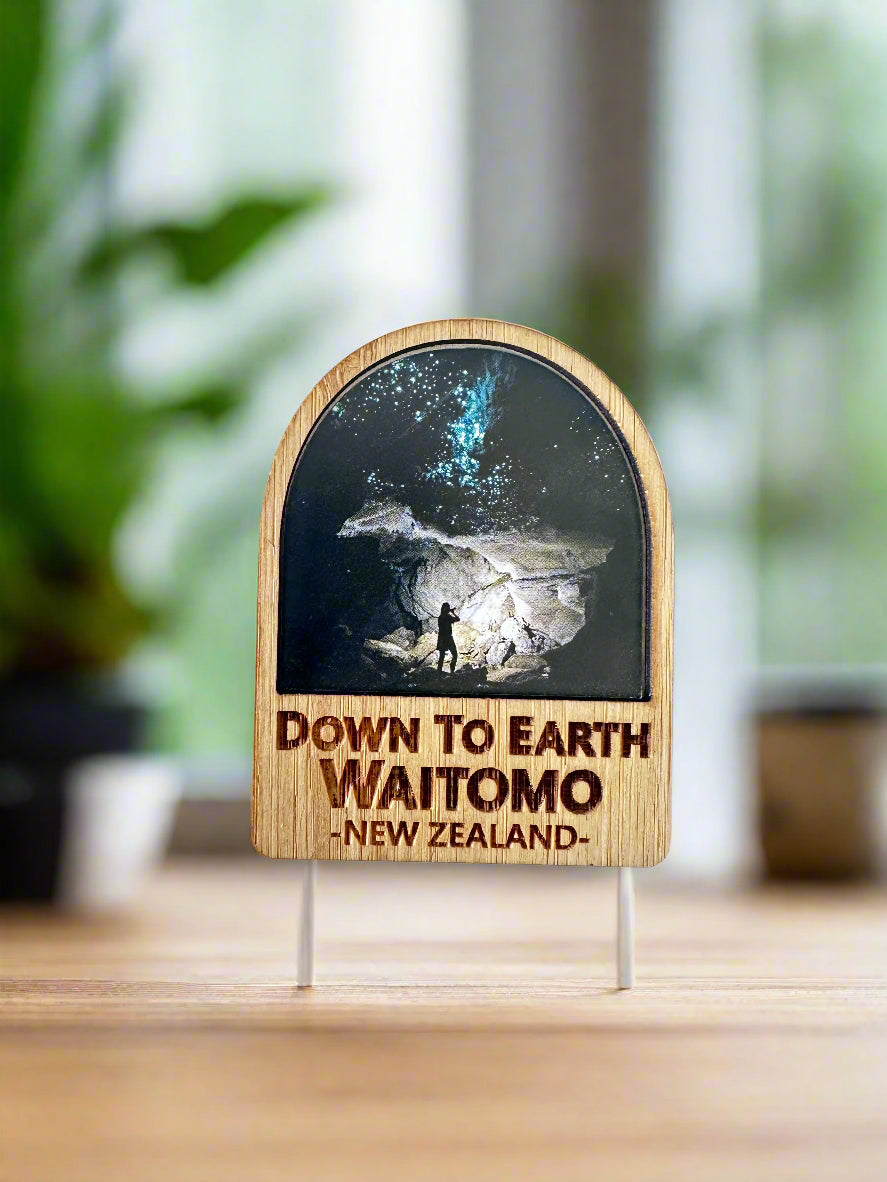 Add an earthly touch to your fridge with our custom bamboo magnet featuring a photo of Waitomo's glowworm cave. Made in New Zealand, the magnet proudly displays our "Down to Earth" slogan. The photo was taking right here in our private cave system! Down-to-earth never looked so good!