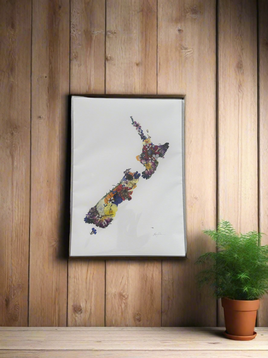 Introducing our Pressed NZ Flowers Map - a unique and playful print made in New Zealand! This is a print of pressed flowers arranged in the shape of the map of New Zealand.